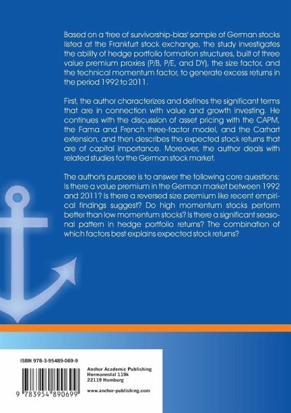 Based on a 'free of survivorship-bias' sample of German stocks listed at the Frankfurt stock exchange, the study investigates the ability of hedge portfolio formation structures, built of three value premium proxies (P/B, P/E, and DY), the size factor, and the technical momentum factor, to generate excess returns in the period 1992 to 2011.