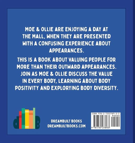 Moe & Ollie are enjoying a day at the Mall, when they are presented with a confusing experience about appearances. This is a book about valuing people for more than their outward appearances. Join as Moe & Ollie discuss the value in every body, learning about body diversity and body positivity.