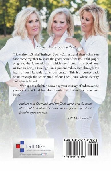 Do you know your value? Triplet sisters, Shella Pittsinger, Shelly Current, and Sherry Garrison have come together to share the good news of the beautiful gospel of grace, the foundation on which they stand. This book was written to bring a true light on a person's value, seen through the heart of our Heavenly Father our creator. This is a journey back home through the redemption of our Lord Jesus, where identity and value is found. We hope to enlighten you along your journey of rediscovering your value that God has placed within you before you were ever born. And the rain descended, and the floods came, and the winds blew, and beat upon the house; and it fell not: for it was founded upon the rock. KJV Matthew 7:25
