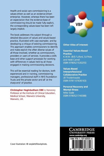 Health and social care commissioning is a values-driven as well as evidence-driven enterprise. However, whereas there has been an expectation that the evidence-base of commissioning should be made fully explicit, the corresponding values-base has been left largely implicit. The book addresses this subject through a detailed discussion of values and values-based practice, illustrated with case examples, and by developing a critique of existing commissioning. This approach enables commissioners to identify and make explicit the often diverse values of all those involved, whether as commissioners, providers or users of services. It provides a skills base and other support processes for working with differences in values held by all those engaged in making commissioning decisions. This will be essential reading for doctors, both experienced and in training, commissioning managers, professional staff in NHS Foundation Trusts and the private sector and all 'at the sharp' end of practice