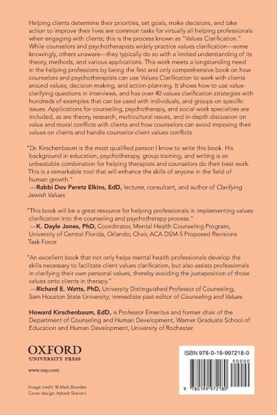 This is the most comprehensive book ever written on how counselors and psychotherapists can work with clients around values, decision-making and action-planning. It shows how to use value-clarifying questions, value-clarifying interviews, and over 40 values clarification strategies with 1,000 or so examples that can be used with individuals and groups on specific issues.