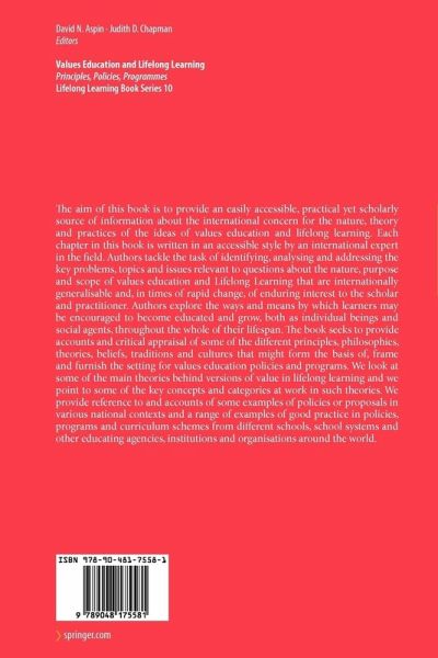 The book seeks to provide accounts and critical appraisal of some of the different principles, philosophies, theories, beliefs, traditions and cultures that might form the basis of, frame and furnish the setting for values education policies and programs. We look at some of the main theories behind versions of value in lifelong learning and we point to some of the key concepts and categories at work in such theories. We provide reference to and accounts of some examples of policies or proposals in various national contexts and a range of examples of good practice in policies, programs and curriculum schemes from different schools, school systems and other educating agencies, institutions and organisations around the world.