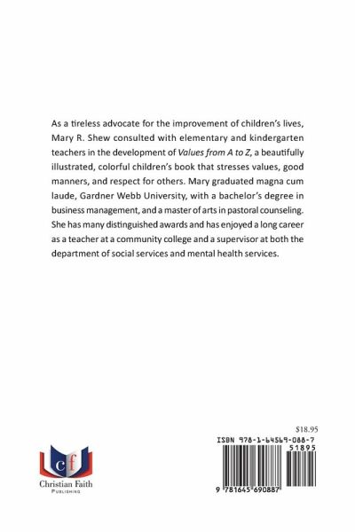 As a tireless advocate for the improvement of children's lives, Mary R. Shew consulted with elementary and kindergarten teachers in the development of Values from A to Z, a beautifully illustrated, colorful children's book that stresses values, good manners, and respect for others. Mary graduated magna cum laude, Gardner Webb University, with a bachelor's degree in business management, and a master of arts in pastoral counseling. She has many distinguished awards and has enjoyed a long career as a teacher at a community college and a supervisor at both the department of social services and mental health services.