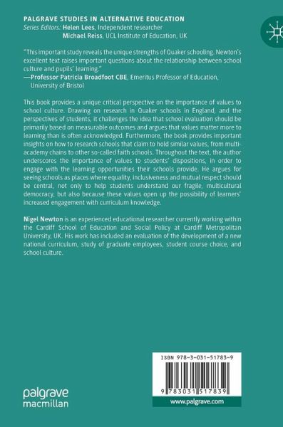 This book provides a unique critical perspective on the importance of values to school culture. Drawing on research in Quaker schools in England, and the perspectives of students, it challenges the idea that school evaluation should be primarily based on measurable outcomes and argues that values matter more to learning than is often acknowledged. Furthermore, the book provides important insights on how to research schools that claim to hold similar values, from multi-academy chains to other so-called faith schools. Throughout the text, the author underscores the importance of values to students' dispositions, in order to engage with the learning opportunities their schools provide. He argues for seeing schools as places where equality, inclusiveness and mutual respect should be central, not only to help students understand our fragile, multicultural democracy, but also because these values open up the possibility of learners' increased engagement with curriculum knowledge.