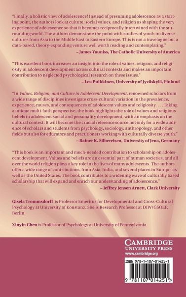 Cultural values and religious beliefs play a substantial role in adolescent development. Developmental scientists have shown increasing interest in how culture and religion are involved in the processes through which adolescents adapt to environments. This volume constitutes a timely and unique addition to the literature on human development from a cultural-contextual perspective. Editors Gisela Trommsdorff and Xinyin Chen present systematic and in-depth discussions of theoretical perspectives, landmark studies and strategies for further research in the field. The eminent contributors reflect…mehr