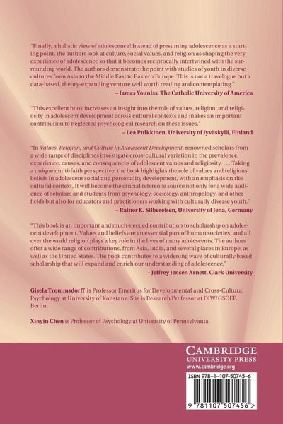 Cultural values and religious beliefs play a substantial role in adolescent development. Developmental scientists have shown increasing interest in how culture and religion are involved in the processes through which adolescents adapt to environments. This volume constitutes a timely and unique addition to the literature on human development from a cultural-contextual perspective. Editors Gisela Trommsdorff and Xinyin Chen present systematic and in-depth discussions of theoretical perspectives, landmark studies and strategies for further research in the field. The eminent contributors reflect…mehr