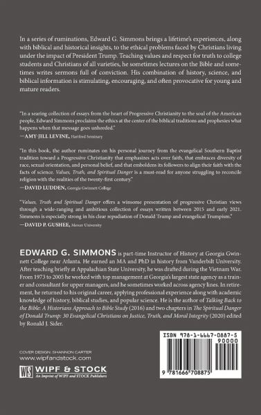 In a series of ruminations, Edward G. Simmons brings a lifetime's experiences, along with biblical and historical insights, to the ethical problems faced by Christians living under the impact of President Trump. Teaching values and respect for truth to college students and Christians of all varieties, he sometimes lectures on the Bible and sometimes writes sermons full of conviction. His combination of history, science, and biblical information is stimulating, encouraging, and often provocative for young and mature readers.