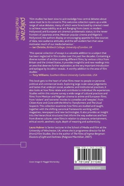 'Film studies has been slow to acknowledge how central debates about value must be to its concerns. This welcome collection opens up a wide range of value debates, many of which were foreclosed by cinema's need to achieve respectability as an art. Ranging from classic vs modern Hollywood, and European art cinema's problematic status, to the newer frontiers of Japanese anime, Mexican popular cinema and Nigeria's Nollywood, the authors displayan encouraging appetite for new sources of data, new audience attitudes, and the self-evident fact that value motivates much of our media behaviour.'