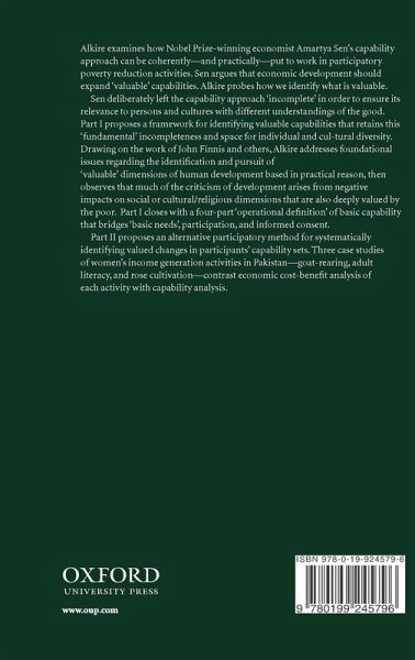 Alkire examines how Nobel Prize-winning economist Amartya Sen's capability approach can be coherently-and practically-put to work in participatory poverty reduction activities. Sen argues that economic development should expand 'valuable' capabilities. Alkire probes how we identify what is valuable. Sen deliberately left the capability approach 'incomplete' in order to ensure its relevance to persons and cultures with different understandings of the good. Part I proposes a framework for identifying valuable capabilities that retains this 'fundamental' incompleteness and space for individual and cultural diversity. Drawing on the work of John Finnis and others, Alkire addresses foundational issues regarding the identification and pursuit of 'valuable' dimensions of human development based in practical reason, then observes that much of the criticism of development arises from negative impacts on social or cultural/religious dimensions that are also deeply valued by the poor. Part I closes with a four-part 'operational definition' of basic capability that bridges 'basic needs', participation, and informed consent. Part II proposes an alternative participatory method for systematically identifying valued changes in participants' capability sets. Three case studies of women's income generation activities in Pakistan---goat-rearing, adult literacy, and rose cultivation---contrast economic cost-benefit analysis of each activity with capability analysis.