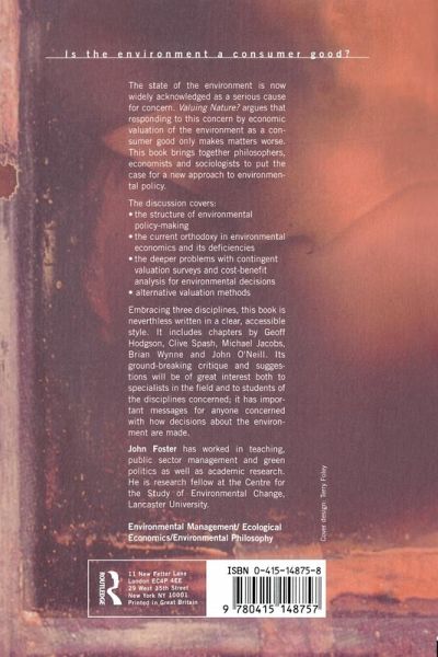 "Valuing Nature?" questions the dominant economic methods of evaluating the environment. Innovatively, it asks what role economics should play in setting our environmental objectives. Topics include: a critique of neo-classical economic thought on the environment; environmental economics, institutions and policy; and relocating environmental economics. Contributors include Geoffrey Hodgson, Clive Spash, Micheal Jacobs, Brian Hynne, John O'Neil.