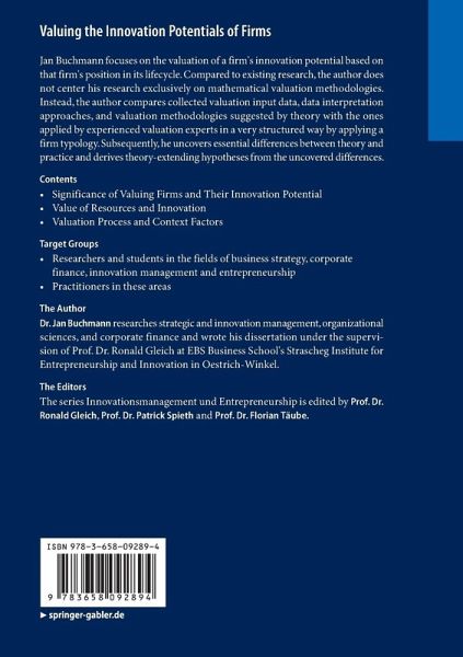Jan Buchmann focuses on the valuation of a firm's innovation potential based on that firm's position in its lifecycle. Compared to existing research, the author does not center his research exclusively on mathematical valuation methodologies. Instead, the author compares collected valuation input data, data interpretation approaches, and valuation methodologies suggested by theory with the ones applied by experienced valuation experts in a very structured way by applying a firm typology. Subsequently, he uncovers essential differences between theory and practice and derives theory-extending hypotheses from the uncovered differences.