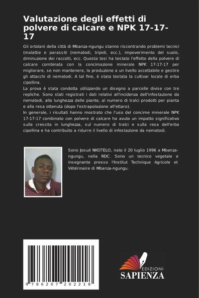 Gli ortolani della città di Mbanza-ngungu stanno riscontrando problemi tecnici (malattie e parassiti (nematodi, tripidi, ecc.), impoverimento del suolo, diminuzione dei raccolti, ecc. Questa tesi ha testato l'effetto della polvere di calcare combinata con la concimazione minerale NPK 17-17-17 per migliorare, se non mantenere, la produzione a un livello accettabile e gestire gli attacchi di nematodi. A tal fine, è stata testata la cultivar locale di erba cipollina.La prova è stata condotta utilizzando un disegno a parcelle divise con tre repliche. Sono stati registrati i dati relativi all'incidenza dell'infestazione da nematodi, alla lunghezza delle piante, al numero di tralci prodotti per pianta e alla resa ottenuta (dopo l'estrapolazione all'ettaro). In generale, i risultati hanno mostrato che l'uso del concime minerale NPK 17-17-17 combinato con polvere di calcare ha avuto un impatto significativo sulla crescita in lunghezza, sul numero di tralci e sulla resa dell'erba cipollina e ha contribuito a ridurre il livello di infestazione da nematodi.
