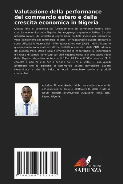 Questo libro si concentra sul funzionamento del commercio estero sulla crescita economica della Nigeria. Per raggiungere questo obiettivo, è stata utilizzata l'analisi del modello di regressione multipla lineare per valutare le varie componenti del commercio estero. Per raggiungere questo obiettivo è stata utilizzata la tecnica dei minimi quadrati ordinari (OLS). I dati utilizzati in questo studio sono stati estratti dal bollettino statistico della CBN, edizione del giubileo d'oro. Dallo studio è emerso che le esportazioni, le importazioni e il tasso di cambio sono tutti correlati negativamente alla produzione reale della Nigeria, rispettivamente con il 19%, l'8,7% e il 52%, mentre l'R 2 corretto è pari al 71% per il periodo dal 1970 al 2005. Si può quindi affermare che le politiche di commercio estero dovrebbero essere riesaminate e che le industrie locali dovrebbero produrre prodotti competitivi.