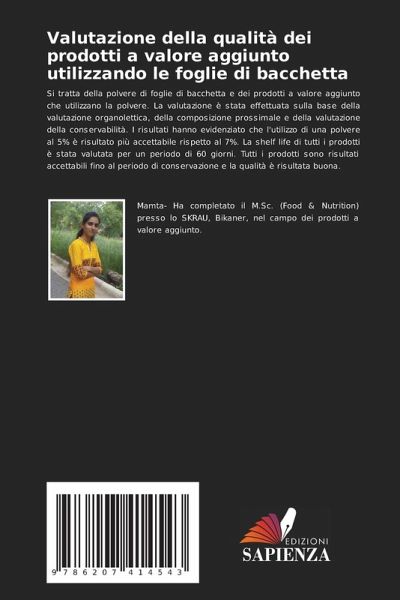 Si tratta della polvere di foglie di bacchetta e dei prodotti a valore aggiunto che utilizzano la polvere. La valutazione è stata effettuata sulla base della valutazione organolettica, della composizione prossimale e della valutazione della conservabilità. I risultati hanno evidenziato che l'utilizzo di una polvere al 5% è risultato più accettabile rispetto al 7%. La shelf life di tutti i prodotti è stata valutata per un periodo di 60 giorni. Tutti i prodotti sono risultati accettabili fino al periodo di conservazione e la qualità è risultata buona.