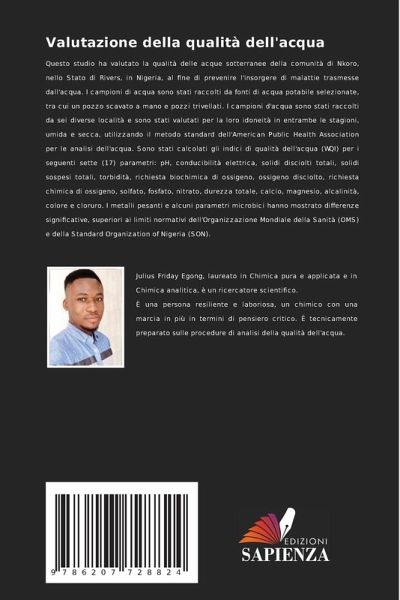 Questo studio ha valutato la qualità delle acque sotterranee della comunità di Nkoro, nello Stato di Rivers, in Nigeria, al fine di prevenire l'insorgere di malattie trasmesse dall'acqua. I campioni di acqua sono stati raccolti da fonti di acqua potabile selezionate, tra cui un pozzo scavato a mano e pozzi trivellati. I campioni d'acqua sono stati raccolti da sei diverse località e sono stati valutati per la loro idoneità in entrambe le stagioni, umida e secca, utilizzando il metodo standard dell'American Public Health Association per le analisi dell'acqua. Sono stati calcolati gli indici di qualità dell'acqua (WQI) per i seguenti sette (17) parametri: pH, conducibilità elettrica, solidi disciolti totali, solidi sospesi totali, torbidità, richiesta biochimica di ossigeno, ossigeno disciolto, richiesta chimica di ossigeno, solfato, fosfato, nitrato, durezza totale, calcio, magnesio, alcalinità, colore e cloruro. I metalli pesanti e alcuni parametri microbici hanno mostrato differenze significative, superiori ai limiti normativi dell'Organizzazione Mondiale della Sanità (OMS) e della Standard Organization of Nigeria (SON).