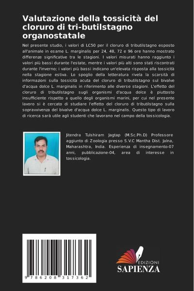 Nel presente studio, i valori di LC50 per il cloruro di tributilstagno esposto all'animale in esame L. marginalis per 24, 48, 72 e 96 ore hanno mostrato differenze significative tra le stagioni. I valori misurati hanno raggiunto i valori più bassi durante l'estate, mentre i valori più alti sono stati riscontrati durante l'inverno; i valori più bassi indicano un'elevata risposta alla tossicità nella stagione estiva. Lo spoglio della letteratura rivela la scarsità di informazioni sulla tossicità acuta del cloruro di tributilstagno sul bivalve d'acqua dolce L. marginalis in riferimento alle diverse stagioni. L'effetto del cloruro di tributilstagno sugli organismi d'acqua dolce è piuttosto insufficiente rispetto a quello degli organismi marini, per cui nel presente lavoro si è cercato di studiare l'effetto del cloruro di tributilstagno sulla sopravvivenza del bivalve d'acqua dolce L. marginalis. Questo tipo di lavoro di ricerca sarà utile agli studenti che lavorano nel campo della tossicologia.