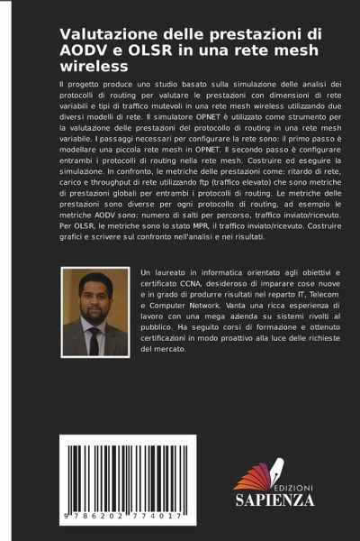 Il progetto produce uno studio basato sulla simulazione delle analisi dei protocolli di routing per valutare le prestazioni con dimensioni di rete variabili e tipi di traffico mutevoli in una rete mesh wireless utilizzando due diversi modelli di rete. Il simulatore OPNET è utilizzato come strumento per la valutazione delle prestazioni del protocollo di routing in una rete mesh variabile. I passaggi necessari per configurare la rete sono: il primo passo è modellare una piccola rete mesh in OPNET. Il secondo passo è configurare entrambi i protocolli di routing nella rete mesh. Costruire ed eseguire la simulazione. In confronto, le metriche delle prestazioni come: ritardo di rete, carico e throughput di rete utilizzando ftp (traffico elevato) che sono metriche di prestazioni globali per entrambi i protocolli di routing. Le metriche delle prestazioni sono diverse per ogni protocollo di routing, ad esempio le metriche AODV sono: numero di salti per percorso, traffico inviato/ricevuto. Per OLSR, le metriche sono lo stato MPR, il traffico inviato/ricevuto. Costruire grafici e scrivere sul confronto nell'analisi e nei risultati.