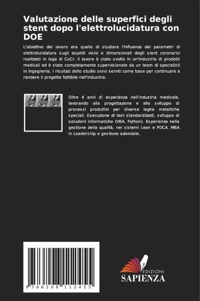 L'obiettivo del lavoro era quello di studiare l'influenza dei parametri di elettrolucidatura sugli aspetti visivi e dimensionali degli stent coronarici realizzati in lega di CoCr. Il lavoro è stato svolto in un'industria di prodotti medicali ed è stato completamente supervisionato da un team di specialisti in ingegneria. I risultati dello studio sono serviti come base per continuare a rendere il progetto fattibile nell'industria.