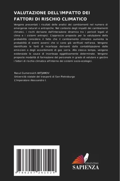 Vengono presentati i risultati delle analisi dei cambiamenti nel numero di emergenze naturali e antropiche. Nel contesto degli impatti dei cambiamenti climatici, i rischi derivano dall'interazione dinamica tra i pericoli legati al clima e i sistemi antropici. L'approccio proposto per la valutazione della probabilità considera il fatto che il cambiamento climatico aumenta la probabilità di eventi avversi che si sono già verificati nell'area. Vengono identificate le fonti di incertezza derivanti dalla contabilizzazione delle emissioni o degli assorbimenti di gas serra. Allo stesso tempo, vengono evidenziate le cause di incertezza oggettivamente determinate. Vengono proposte modalità di formazione del personale in grado di valutare e gestire i fattori di rischio climatico all'interno dei sistemi socio-ecologici.