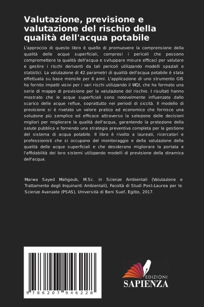 L'approccio di questo libro è quello di promuovere la comprensione della qualità delle acque superficiali, compresi i pericoli che possono compromettere la qualità dell'acqua e sviluppare misure efficaci per valutare e gestire i rischi derivanti da tali pericoli utilizzando modelli spaziali e statistici. La valutazione di 42 parametri di qualità dell'acqua potabile è stata effettuata su base mensile per 6 anni. L'applicazione di uno strumento GIS ha fornito impatti visivi per i vari rischi utilizzando il WQI, che ha formato una serie di mappe di previsione per la valutazione del rischio. I risultati hanno mostrato che le acque superficiali sono notevolmente influenzate dallo scarico delle acque reflue, soprattutto nei periodi di siccità. Il modello di previsione si è rivelato un valore pratico ed economico che fornisce una soluzione più semplice ed efficace attraverso la selezione delle decisioni migliori per migliorare la qualità dell'acqua, garantendo la protezione della salute pubblica e fornendo una strategia preventiva completa per la gestione del sistema di acqua potabile. Il libro è rivolto a laureati, ricercatori e professionisti che si occupano del monitoraggio e della valutazione della qualità delle acque superficiali e che desiderano migliorare la portata e l'affidabilità dei loro sistemi utilizzando modelli di previsione della dinamica dell'acqua.