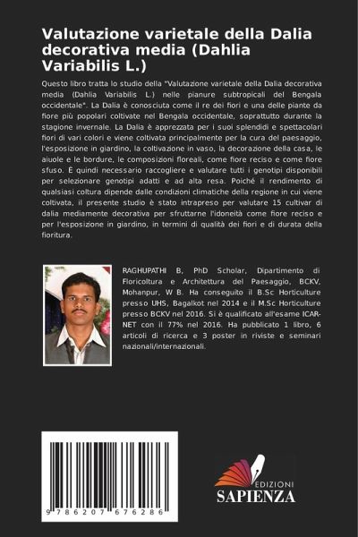 Questo libro tratta lo studio della "Valutazione varietale della Dalia decorativa media (Dahlia Variabilis L.) nelle pianure subtropicali del Bengala occidentale". La Dalia è conosciuta come il re dei fiori e una delle piante da fiore più popolari coltivate nel Bengala occidentale, soprattutto durante la stagione invernale. La Dalia è apprezzata per i suoi splendidi e spettacolari fiori di vari colori e viene coltivata principalmente per la cura del paesaggio, l'esposizione in giardino, la coltivazione in vaso, la decorazione della casa, le aiuole e le bordure, le composizioni floreali, come fiore reciso e come fiore sfuso. È quindi necessario raccogliere e valutare tutti i genotipi disponibili per selezionare genotipi adatti e ad alta resa. Poiché il rendimento di qualsiasi coltura dipende dalle condizioni climatiche della regione in cui viene coltivata, il presente studio è stato intrapreso per valutare 15 cultivar di dalia mediamente decorativa per sfruttarne l'idoneità come fiore reciso e per l'esposizione in giardino, in termini di qualità dei fiori e di durata della fioritura.