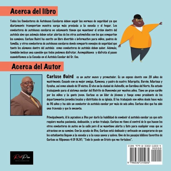 Todos los Conductores de Autobuses Escolares deben seguir las normas de seguridad ya que diariamente transportan nuestra carga más preciada a la escuela y el hogar. Los conductores de autobuses escolares no solamente tienen que mantener el orden dentro del autobús sino que además deben estar alertas de los otros automóviles con los que comparten los caminos. Carluse Baird ha escrito un libro divertido e informativo para niños, padres de familia, y otros conductores de autobuses escolares donde comparte consejos de seguridad que tanto los alumnos dentro del autobús como conductores de autobús deben saber. Además, también incluye una canción que todos podemos disfrutar. Acompáñanos y disfruta el paseo cuandoVamos a la Escuela en el Autobús Escolar del Sr. Cee. Carluse Baird es un autor nuevo y prometedor. Es un esposo devoto con 28 años de matrimonio. Casado con su mejor amiga, Ramona, y padre de cuatro: Marquita, Darvin, Marissa y Cyesha, así como abuelo de 13 nietos. Él vive en la ciudad de Asheville, en Carolina del Norte. Ha estado trabajando para el sistema escolar del Distrito de Buncombe por muchos años. Tiene un gran cariño por los niños y la gente joven. Carluse es un líder de jóvenes y funge como presidente de los departamentos juveniles locales y distritales de su iglesia. El ha trabajado con niños desde hace más de 30 años y ha sido un conductor de autobús escolar por más de seis años. Carluse dice que ha sido una travesía y que le encanta. Principalmente, èl le agradece a Dios por darle la habilidad de conducir el autobús escolar ya que esto requiere mucha paciencia, dedicación, y arduo trabajo. Carluse no tiene el control de lo que hacen los otros conductores de autos en la calle pero él se mantiene alerta y listo para cualquier cosa que se atraviese en su camino. Con la ayuda de Dios, Carluse está dedicado y enfocado en asegurarse de que los estudiantes lleguen a la escuela y a la casa sanos y salvos. Uno de los pasajes bíblicos favoritos de Carluse es Filipenses 4:13 (KJV), "Todo lo puedo en Cristo que me fortalece".