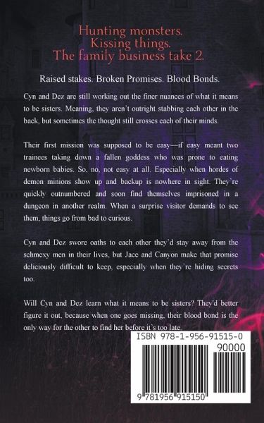 Hunting monsters. Kissing things. The family business take 2. Raised stakes. Broken Promises. Blood Bonds. Cyn and Dez are still working out the finer nuances of what it means to be sisters. Meaning, they aren't outright stabbing each other in the back, but sometimes the thought still crosses each of their minds. Their first mission was supposed to be easy-if easy meant two trainees taking down a fallen goddess who was prone to eating newborn babies. So, no, not easy at all. Especially when hordes of demon minions show up and backup is nowhere in sight. They're quickly outnumbered and soon find themselves imprisoned in a dungeon in another realm. When a surprise visitor demands to see them, things go from bad to curious. Cyn and Dez swore oaths to each other they'd stay away from the schmexy men in their lives, but Jace and Canyon make that promise deliciously difficult to keep, especially when they're hiding secrets too. Will Cyn and Dez learn what it means to be sisters? They'd better figure it out, because when one goes missing, their blood bond is the only way for the other to find her before it's too late. Tropes include: Enemies to Lovers Vampires Grumpy Cinnamon Roll & Sunshine Love Interests Forced Proximity Who did this to you? Fierce Females Amazing Sisterhood Secrets & Twists Witty Banter Sassy sisters, mysterious men, and closets full of secrets. Hold onto your chastity belts because it's going to be a wild ride!