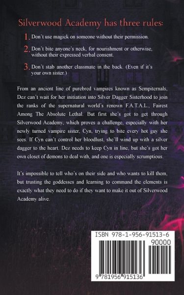 Hunting monsters. Kissing things. The family business. Two sisters. One Supernatural Academy. A destiny they can't escape. From an ancient line of purebred vampires known as Sempiternals, Dez can't wait for her initiation into Silver Dagger Sisterhood to join the ranks of the supernatural world's renown F.A.T.A.L., Fairest Among The Absolute Lethal. But first she's got to get through Silverwood Academy, which proves a challenge, especially with her newly turned vampire sister, Cyn, trying to bite every hot guy she sees. If Cyn can't control her bloodlust, she'll wind up with a silver dagger to the heart. Dez needs to keep Cyn in line, but she's got her own closet of demons to deal with, and one is especially scrumptious. It's impossible to tell who's on their side and who wants to kill them, but trusting the goddesses and learning to command the elements is exactly what they need to do if they want to make it out of Silverwood Academy alive. Hold onto your chastity belts because it's going to be a wild ride! If you love GK Derosa, CN Crawford, Leia Stone, KF Breene, and Linsey Hall, you'll enjoy Silver Dagger Sisterhood. Scroll up and one click now to devour Vamp Revealed, a dark and twisty romance today!