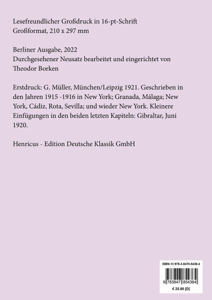 Hanns Heinz Ewers: Vampir. Ein verwilderter Roman in Fetzen und FarbenLesefreundlicher Großdruck in 16-pt-SchriftGroßformat, 210 x 297 mmBerliner Ausgabe, 2022Durchgesehener Neusatz bearbeitet und eingerichtet von Theodor BorkenErstdruck: G. Müller, München/Leipzig 1921. Geschrieben in den Jahren 1915 -1916 in New York; Granada, Málaga; New York, Cádiz, Rota, Sevilla; und wieder New York. Kleinere Einfügungen in den beiden letzten Kapiteln: Gibraltar, Juni 1920.Umschlagabbildung: Edvard Munch, Rød villvin, 1898-1900Gesetzt aus der Minion Pro, 16 pt.Henricus - Edition Deutsche Klassik GmbH
