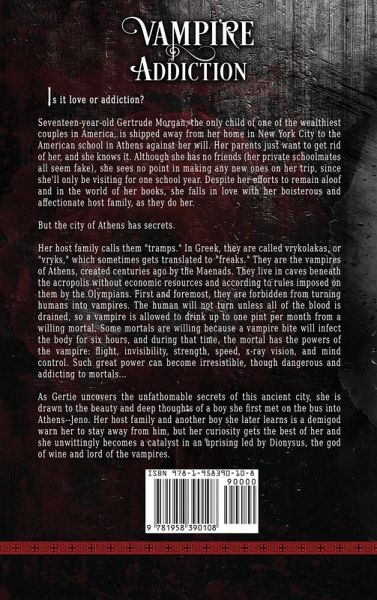 Is it love or addiction? Seventeen-year-old Gertrude Morgan, the only child of one of the wealthiest couples in America, is shipped away from her home in New York City to the American school in Athens against her will. But the city of Athens has secrets. Her host family calls them "tramps." In Greek, they are called vrykolakas, or "vryks," which sometimes gets translated to "freaks." They are the vampires of Athens, created centuries ago by the Maenads. They live in caves beneath the acropolis without economic resources and according to rules imposed on them by the Olympians. First and foremost, they are forbidden from turning humans into vampires. The human will not turn unless all of the blood is drained, so a vampire is allowed to drink up to one pint per month from a willing mortal. Some mortals are willing because a vampire bite will infect the body for six hours, and during that time, the mortal has the powers of the vampire: flight, invisibility, strength, speed, x-ray vision, and mind control. Such great power can become irresistible, though dangerous and addicting to mortals... As seventeen-year-old Gertie, studying abroad from New York, uncovers the unfathomable secrets of this ancient city, she becomes involved with a handsome vampire. Is it love that attracts her, or the temporary powers from his bite? She's more confused when her heart is drawn to the vampire's enemy--a demigod sworn to protect the city--and she becomes an unwitting catalyst to war. This young adult fantasy series shares the word of The Underworld Saga and is for lovers of Greek mythology, paranormal romance, and action and adventure.