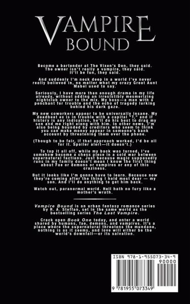 Become a bartender at The Vixen's Den, they said. The owner isn't really a vampire, they said. It'll be fun, they said. And suddenly I'm neck deep in a world I've never really believed in, no matter what my crazy Great Aunt Mabel used to say. Seriously, I have more than enough drama in my life already, without adding an irresistibly mesmerizing nightclub owner to the mix. My boss-a man with a penchant for trouble and the echo of tragedy lurking behind his dark gaze. My new coworkers appear to be universally insane. My deadbeat ex is in trouble with a capital "T," and if history is any indication, he'll do his best to drag my son and me right along with him. In other news, I'm also being hounded by creditors who seem to think you can make money appear in someone's bank account by threatening them over the phone. (Though to be fair, if that approach worked, I'd be all for it. Spoiler alert-it doesn't.) To top it all off, while my back was turned, I've somehow become a chess piece in a cold war between supernatural factions. Just because magic supposedly runs in my family doesn't mean I know the first thing about Fae or demons or vampires or any of this craziness. But it looks like I'm gonna have to learn. Because now they're coming after the thing I hold most dear - my son. And I'll do anything to get him back. Watch out, paranormal world. Hell hath no fury like a mother's wrath. * * * Vampire Bound is a new urban fantasy romance series by R. A. Steffan, set in the same world as the bestselling series The Last Vampire. Crack open Book One today, and enter a world shared by humans, fae, demons, and vampires. It's a place where the supernatural threatens the mundane, nothing is as it seems, and love will either be the world's downfall-or its salvation.