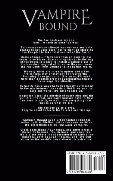 The Fae enslaved my son. Now I'm their prisoner as well. This crazy rescue attempt was our one and only chance to get Jace back, not to mention stopping the Fae plot to take total control of the Earth. Some chance-it took less than an hour for our cover to be blown. Now nothing stands in the way of the Unseelie's plan to install a ruling class of brainwashed magical children so they can move the Fae Court from Dhuinne to the human realm. My only allies are three vampires and a Fae traitor who may or may not be trustworthy. Assuming I can get out of this mess, I'll need more than a ragtag crew of supernatural rejects to salvage the situation. Humanity has always been hopelessly outclassed in the war between the realms. But if we want to save our world, it's time to step up. Magic isn't just the purview of eccentrics and the gullible. It's real, and some humans have it. Now we need to use it, or we'll lose everything that makes us what we are. The Fae see us as slaves. They're about to learn that slaves can rise up. * * * Vampire Bound is a new urban fantasy romance series by R. A. Steffan, set in the same world as the bestselling series The Last Vampire. Grab the final book today, and enter a world shared by humans, fae, demons, and vampires. It's a place where the supernatural threatens the mundane, nothing is as it seems, and love will either be the world's downfall-or its salvation.