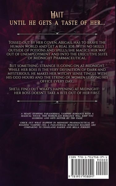 Wait until he gets a taste of her.Tossed out by her coven, Abigail has to brave the human world and get a real job. With no skills outside of potions and spells, she magics her way out of unemployment and into the executive suite of Midnight Pharmaceutical.But something strange is going on at Midnight. While her boss is the very definition of dark and mysterious, he makes her witchy sense tingle with his odd hours and the string of women leaving his office every day...She'll find out what's happening at Midnight; if her boss doesn't take a bite out of her first.