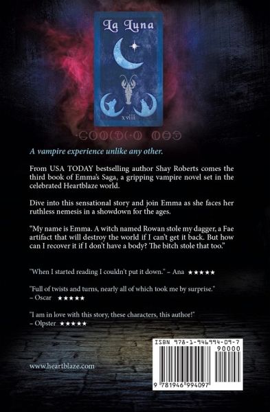 A hijacked body. A wicked immortality scheme. A race through time to save the world. Emma Rue has lost everything. Her soulmate. Her Fae dagger. And her very body. Rowan has ambushed Emma and taken everything from her. Emma awakens in a phantom world built of memories. But without a body, how can she escape? And how can she stop Rowan from becoming immortal and destroying the world? Emma discovers her soul is still free to travel through her past and future lives. With Stefan and her allies desperately searching for her in the present, she uses this unique power to bring the fight to the Empress of Witches. Yet Rowan's influence spans multiple timeframes, and Emma sees the witch has been setting traps across history. Can Emma outwit her diabolical adversary? And what price must Emma pay to rescue the world from a grim fate? Vampire Eternal weaves together transcendent romance and heart-stopping paranormal action. Featuring multiple POVs, court intrigue, post-apocalyptic survival, and a love that transcends death itself, this dark paranormal romance delivers everything fans crave. Join Emma's heart-wrenching journey to free her soulmate and save humanity-buy today! "When I started reading I couldn't put it down." - Ana ¿¿¿¿¿ "Full of twists and turns, nearly all of which took me by surprise." - Oscar ¿¿¿¿¿ "I am in love with this story, these characters, this author!" - Olpster ¿¿¿¿¿ ____________________________________________________________________ The complete Heartblaze series, by bestselling author Shay Roberts: The vampire, werewolf, and dragon books can be read as standalone trilogies. But if you want to experience the entire Heartblaze world, this is the recommended reading order for all nine books. ¿ Vampire Soul ¿ Vampire Rising ¿ Vampire Eternal ¿ Werewolf Unchained ¿ Werewolf Unbroken ¿ Werewolf Undying ¿ Dragon Blood ¿ Dragon War ¿ Dragon Soul
