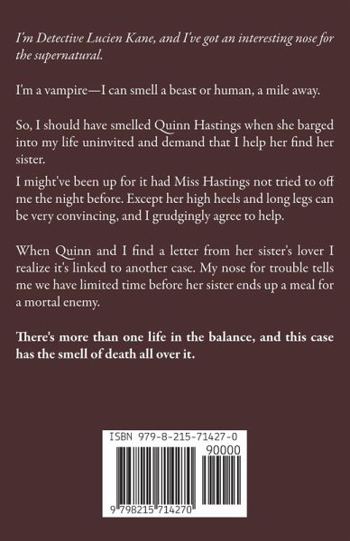 I'm Detective Lucien Kane, and I've got an interesting nose for the supernatural. I'm a vampire-I can smell a beast or human, a mile away. So, I should have smelled Quinn Hastings when she barged into my life uninvited and demand that I help her find her sister. I might've been up for it had Miss Hastings not tried to off me the night before. Except her high heels and long legs can be very convincing, and I grudgingly agree to help. When Quinn and I find a letter from her sister's lover I realize it's linked to another case. My nose for trouble tells me we have limited time before her sister ends up a meal for a mortal enemy. There's more than one life in the balance, and this case has the smell of death all over it.