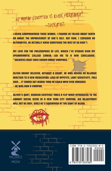 Socrates once said, "No human condition is ever permanent." I never comprehended these words. I figured he talked about death or about the improvement of one's self. But now, I consider an alternative, he actually knew something the rest of us didn't. My love for the philosophies of life, which I've studied over my epigrammatic college career, led me to a new conclusion, "Socrates must have known about vampires." Oliver Brixby believed, without a doubt, he was having an allergic reaction to a new medication: loss of appetite, light sensitivity, pale skin... it turned out worse than he could have ever imagined - he was now a vampire. Oliver's quiet, bookish existence takes a flip when introduced to the vibrant social scene of a New York City vampire. His adjustment will not be easy, since he's squeamish at the sight of blood.