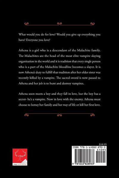 What would you do for love? Would you give up everything you have? Everyone you love? Athena is a girl who is a descendant of the Malachite family. The Malachites are the head of the most elite vampire slaying organization in the world and it is tradition that every single person who is a part of the Malachite bloodline becomes a slayer. It is now Athena's duty to fulfill that tradition after her older sister was recently killed by a vampire. The sacred sword is now passed to Athena and her job is to hunt and destroy vampires. Athena soon meets a boy and they fall in love, but the boy has a secret- he's a vampire. Now in love with the enemy, Athena must choose to betray her family and her way of life or kill her first love.