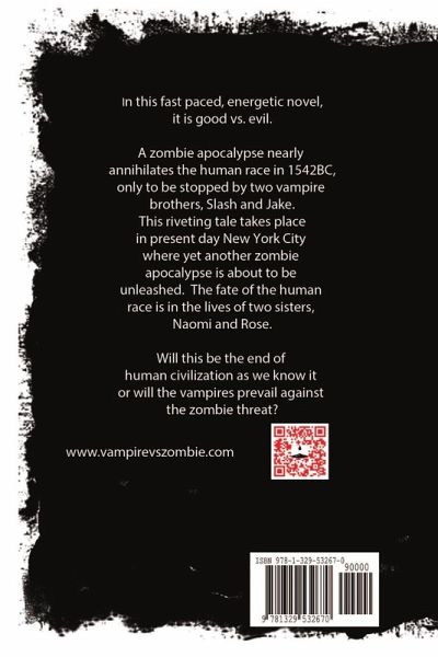 Vampire Vs. Zombie : THE BITE In this fast paced, energetic novel, it is good vs. evil. A zombie apocalypse nearly annihilates the human race in 1542BC, only to be stopped by two vampire brothers, Slash and Jake. This riveting tale takes place in present day New York City where yet another zombie apocalypse is about to be unleashed. The fate of the human race is in the lives of two sisters, Naomi and Rose. Will this be the end of human civilization as we know it or will the vampires prevail against the zombie threat?