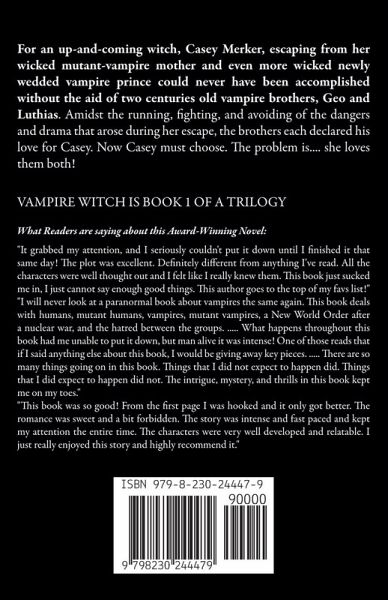 For an up-and-coming witch, Casey Merker, escaping from her wicked mutant-vampire mother and even more wicked newly wedded vampire prince could never have been accomplished without the aid of two centuries old vampire brothers, Geo and Luthias. Amidst the running, fighting, and avoiding of the dangers and drama that arose during her escape, the brothers each declared his love for Casey. Now Casey must choose. The problem is.... she loves them both! VAMPIRE WITCH IS BOOK 1 OF A TRILOGY What Readers are saying about this Award-Winning Novel: "It grabbed my attention, and I seriously couldn't put…mehr