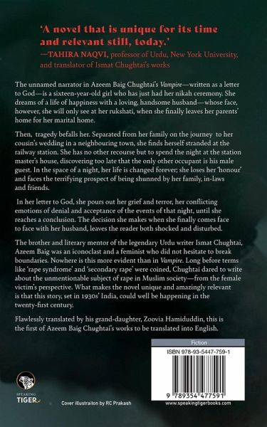 The unnamed narrator in Azeem Baig Chughtai's Vampire-written as a letter to God-is a 16-year-old girl who has just had her nikah ceremony. She dreams of a life of happiness with a loving, handsome husband-whose face, however, she will only see at her rukhsati, when she finally leaves her parents' home for her marital home. Then, tragedy befalls her. Separated from her family on the journey to her cousin's wedding in a neighbouring town, she finds herself stranded at the railway station. She has no other recourse but to spend the night at the station master's house, discovering too late that the only other occupant is his male guest. In the space of a night, her life is changed forever; she loses her 'honour' and faces the terrifying prospect of being shunned by her family, in-laws and friends. In her letter to God, she pours out her grief and terror, her conflicting emotions of denial and acceptance of the events of that night, until she reaches a conclusion. The decision she makes when she finally comes face to face with her husband, leaves the reader both shocked and disturbed. The brother and literary mentor of the legendary Urdu writer Ismat Chughtai, Azeem Baig was an iconoclast and a feminist who did not hesitate to break boundaries. Nowhere is this more evident than in Vampire. Long before terms like 'rape syndrome' and 'secondary rape' were coined, Chughtai dared to write about the unmentionable subject of rape in Muslim society-from the female victim's perspective. What makes the novel unique and amazingly relevant is that this story, set in 1930s' India, could well be happening in the twenty-first century. Flawlessly translated by his grand-daughter, Zoovia Hamiduddin, this is the first of Azeem Baig Chughtai's works to be translated into English.