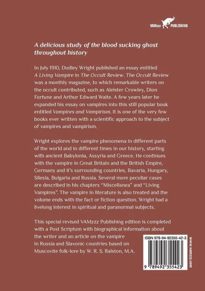 A delicious study of the blood sucking ghost throughout history In July 1910, Dudley Wright published an essay entitled A Living Vampire in The Occult Review. The Occult Review was a monthly magazine, to which remarkable writers on the occult contributed, such as Aleister Crowley, Dion Fortune and Arthur Edward Waite. A few years later he expanded his essay on vampires into this still popular book entitled Vampires and Vampirism. It is one of the very few books ever written with a scientific approach to the subject of vampires and vampirism. Wright explores the vampire phenomena in different parts of the world and in different times in our history, starting with ancient Babylonia, Assyria and Greece. He continues with the vampire in Great Britain and the British Empire, Germany and it's surrounding countries, Bavaria, Hungary, Silesia, Bulgaria and Russia. Several more peculiar cases are described in his chapters "Miscellanea" and "Living Vampires". The vampire in literature is also treated and the volume ends with the fact or fiction question. Wright had a livelong interest in spiritual and paranormal subjects. This special revised VAMzzz Publishing edition is completed with a Post Scriptum with biographical information about the writer and an article on the vampire in Russia and Slavonic countries based on Muscovite folk-lore by W. R. S. Ralston, M.A.