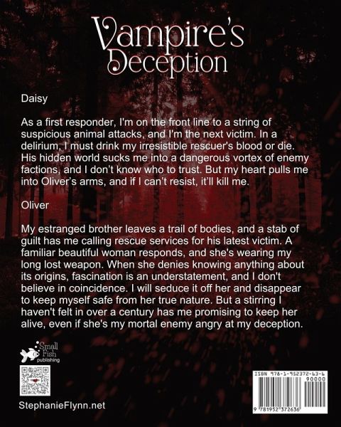 Daisy As a first responder, I'm on the front line to a string of suspicious animal attacks, and I'm the next victim. In a delirium, I must drink my irresistible rescuer's blood or die. His hidden world sucks me into a dangerous vortex of enemy factions, and I don't know who to trust. But my heart pulls me into Oliver's arms, and if I can't resist, it'll kill me. Oliver My estranged brother leaves a trail of bodies, and a stab of guilt has me calling rescue services for his latest victim. A familiar beautiful woman responds, and she's wearing my long-lost weapon. When she denies knowing anything about its origins, fascination is an understatement, and I don't believe in coincidence. I will seduce it off her and disappear to keep myself safe from her true nature. But a stirring I haven't felt in over a century has me promising to keep her alive, even if she's my mortal enemy angry at my deception. A steamy paranormal romance series featuring a charismatic, rich, smoking hot bad boy with a heart of gold, the woman he protects from his mortal enemies, who has secrets of her own, and a gritty hidden world of feuding vampires, witches, and elves in small town Marinette, Wisconsin. Perfect for fans of The Vampire Diaries and angsty supernatural soap operas! Vampire's Deception is the first book of the Immortal Protector series. Oliver's and Daisy's story continues in Vampire's Secret (book 2) and concludes in Vampire's Promise (book 3). Each book has an HFN and an HEA at the end of the trilogy. NOTE: This is the Large Print Edition formatted as recommended by the American Council of the Blind. Features include: no italics, 18-point Open Sans font spaced 1.5 lines, and left-aligned text. Get your large print paperback copy and begin an addictive new series!