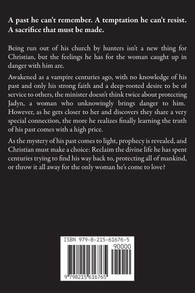 A past he can't remember. A temptation he can't resist. A sacrifice that must be made. Being run out of his church by hunters isn't a new thing for Christian, but the feelings he has for the woman caught up in danger with him are. Awakened as a vampire centuries ago, with no knowledge of his past and only his strong faith and a deep-rooted desire to be of service to others, the minister doesn't think twice about protecting Jadyn, a woman who unknowingly brings danger to him. However, as he gets closer to her and discovers they share a very special connection, the more he realizes finally learning the truth of his past comes with a high price. As the mystery of his past comes to light, prophecy is revealed, and Christian must make a choice: Reclaim the divine life he has spent centuries trying to find his way back to, protecting all of mankind, or throw it all away for the only woman he's come to love?