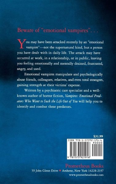 Emotional vampires are individuals we deal with in daily life who leave us feeling normally angry, confused, upset, or fatigued. These manipulative psychological leeches may be total strangers or our best friends, co-workers or family members. By controlling situations and people for their own purposes they prey upon their victims with the deliberate aim of stealing emotional energy - just like mythical vampires. Many of these predators know exactly how much frustration, anger, and anxiety they inflict, while others carry on virtually unaware of the damage they cause, and victims are many times unaware that they are being bled. These vampire attacks may be one-time interactions or they could go on for years. They can range from just being emotionally troublesome to threatening the careers, mental health, and even the lives of their victims. This work identifies and classifies emotional predators, exposes the methods they use, describes the collective "vampirism" of groups, and offers ways to combat the effects of an emotional attack.
