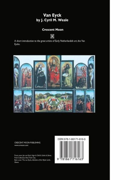 VAN EYCK By James Cyril M. Weale A fully illustrated introduction to one of the masters of Early Netherlandish painting, Jan van Eyck (c. 1390-1441), commonly described as the founder of modern oil painting. Includes a study of Van Eyck's brother, Hubert. Early Netherlandish painting, also known as Flemish painting, is characterized by figurative realism, its incredible sense of domestic interiors and details, luminous light, its 'realist' faces, and its fusions of a micro- and macro- cosmic vision. All Early Netherlandish paintings were made on wood panels, and painted from light to dark in thin glazes. It is partly this subtle glazing which gives Early Netherlandish painting its glorious luminescence. The Early Netherlandish artists exploited the effects of different hues and thicknesses of glazes of oil paint, controlling how the glazes reflected light. Fully illustrated in a brand new format, including contemporaries of Van Eyck. Bibliography and notes. Painters Series. 100 pages. www.crmoon.com