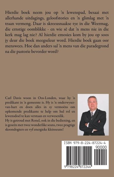 Hierdie boek neem jou op 'n lewenspad, besaai met allerhande uitdagings, geloofstories en 'n glimlag met 'n traan vermeng. Daar is skreeusnaakse tye in die Weermag, die ernstige oomblikke - en wie sê dat 'n mens nie in die kerk mag lag nie? Al hierdie emosies kom by jou op soos jy deur die boek meegseleur word. Hierdie boek gaan oor menswees. Hoe dan anders sal 'n mens van die paradegrond na die pastorie bevorder word?