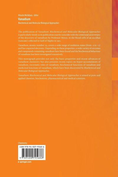 The publication of Vanadium: Biochemical and Molecular Biological Approaches is particularly timely as it exactly coincides with the centennial anniversary of the discovery of vanadium by Professor Henze, in the blood cells of an ascidian (tunicate) collected in Gulf of Naples in 1911. Vanadium, atomic number 23, covers a wide range of oxidation states (from -2 to +5) and has unpaired electrons. Depending on these properties, a wide variety of enzymes and compounds containing vanadium have been found and the biochemical behaviour of vanadium has been investigated extensively.