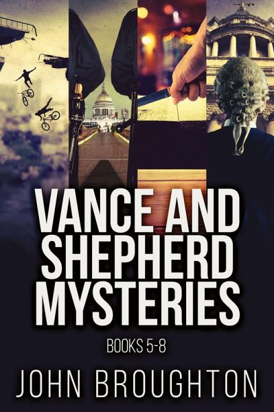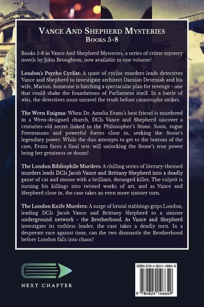 Books 5-8 in Vance And Shepherd Mysteries, a series of crime mystery novels by John Broughton, now available in one volume! London's Psycho Cyclist: A spate of cyclist murders leads detectives Vance and Shepherd to investigate architect Damian Devenish and his wife, Marion. Someone is hatching a spectacular plan for revenge - one that could shake the foundations of Parliament itself. In a battle of wits, the detectives must unravel the truth before catastrophe strikes. The Wren Enigma: When Dr. Amelia Evans's best friend is murdered in a Wren-designed church, DCIs Vance and Shepherd uncover a centuries-old secret linked to the Philosopher's Stone. Soon, rogue Freemasons and powerful forces close in, seeking the Stone's legendary power. While the duo attempts to get to the bottom of the case, Evans faces a final test: will unlocking the Stone's true power bring her greatness or doom? The London Bibliophile Murders: A chilling series of literary-themed murders leads DCIs Jacob Vance and Brittany Shepherd into a deadly game of cat and mouse with a brilliant, deranged killer. The culprit is turning his killings into twisted works of art, and as Vance and Shepherd close in, the case takes an even more sinister turn. The London Knife Murders: A surge of brutal stabbings grips London, leading DCIs Jacob Vance and Brittany Shepherd to a sinister underground network - the Brotherhood. As Vance and Shepherd investigate its ruthless leader, the case takes a deadly turn. In a desperate race against time, can the two dismantle the Brotherhood before London falls into chaos?