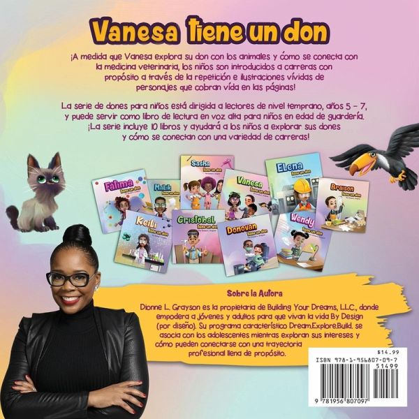 Español: ¡A medida que Vanesa explora su don con los animales y cómo se conecta con la medicina veterinaria, los niños son introducidos a carreras con propósito a través de la repetición e ilustraciones vívidas de personajes que cobran vida en las páginas! La serie de dones para niños está dirigida a lectores de nivel temprano, años 5 - 7, y puede servir como libro de lectura en voz alta para niños en edad de guardería. ¡La serie incluye 10 libros y ayudará a los niños a explorar sus dones y cómo se conectan con una variedad de carreras! English: As Vanessa explores her gift with animals and how it connects to veterinary medicine, children are introduced to purposeful careers with repetition, sight words, and vivid illustrations of characters who come to life on the pages! The Children's Gift Series targets early level readers, ages 5 - 7, and can serve as read-aloud books for daycare ages. The series features 10 books that will help children explore their gifts and how they connect with a variety of careers.