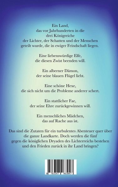 Ein Land, das vor Jahrhunderten in die drei Königreiche der Lichter, der Schatten und der Menschen geteilt wurde, die in ewiger Feindschaft liegen.Eine liebenswürdige Elfe, die diesen Zwist beenden will.Ein alberner Dämon, der seine blauen Flügel liebt.Eine schöne Hexe, die sich nicht um die Probleme anderer schert.Ein stattlicher Fae, der seine Ehre zurückgewinnen will.Ein menschliches Mädchen, das auf Rache aus ist.Das sind die Zutaten für ein turbulentes Abenteuer quer über die ganze Landkarte. Doch werden die 5 gegen die königlichen Dryaden des Lichterreichs bestehen und den Frieden zurück in ihr Land bringen?Als Vanessa von einem hilflosen Dämon auf der Flucht aus ihrem sorglosen Leben gerissen wird, ist ihr Unmut gewaltig. Besonders als die beiden, die von einem rachsüchtigen Mädchen verfolgt werden, versehentlich die sicheren Gefilde des Schattenreichs verlassen und hinter feindlichen Linien der arroganten Lichterprinzessin, ihrem schweigsamen Bruder begegnen und ihrer Armee aus Fae-Kriegern begegnen. Fünf sehr unterschiedlichen Persönlichkeiten aus den verschiedenen Reichen treffen aufeinander, harmonieren rein gar nicht, tun sich aber trotzdem zusammen, um sich in Sicherheit zu bringen. Doch Feindseligkeit und Angst sind allgegenwertig. Das bricht Vanessas Herz. Nun gilt es, den Grund für den Zwist zwischen den Reichen herauszufinden und eine Lösung zu suchen, denn so kann es nicht weitergehen.